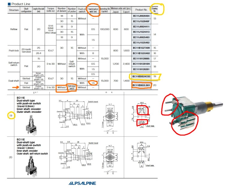 The yellow marks highlight the advertised product, the orange marks highlight the similar looking product single encoder with switch function, that is more or less what i received in my order. One shaft has the encoder function (outer shaft), the other has the switch function (inner shaft), reversed according to the datasheet for the similar looking product (EC11E0B2LB01). The biggest discrepancy are shown by the red marks, the pin arrangement of the encoder pins.