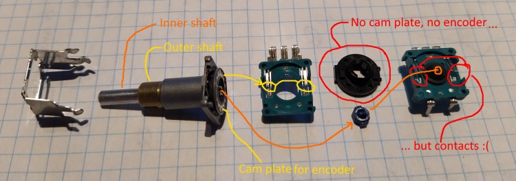 The outer shaft drives a cam plate interacting with the contacts as excpected, but the inner shaft just provides interaction with the switch contact. Instead of a cam plate there is a black plastic “spacer”, no encoder function even if there are contacts for it available.