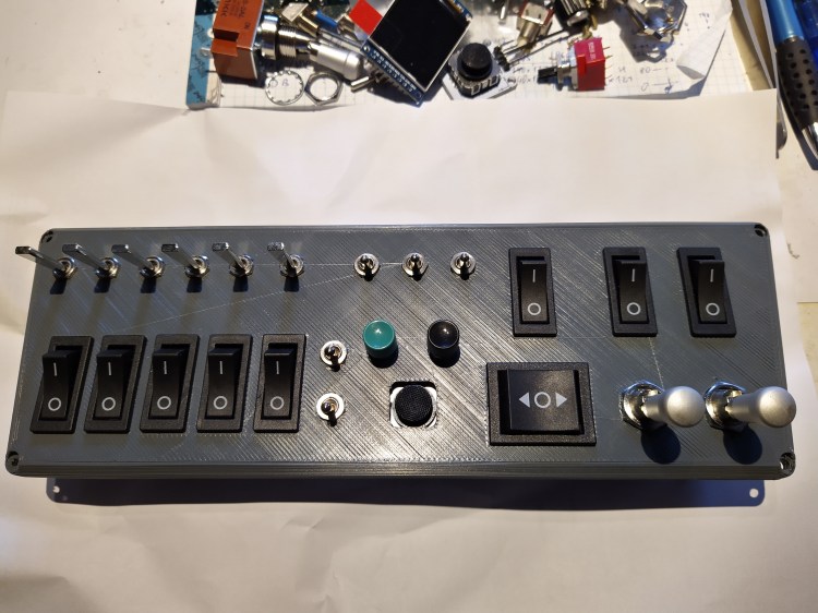 The first panel is printed and i assembled all switches. Of course as usual in a “prototype” something is wrong or fails or explodes … i totally forgot that there should also be a labeling and space for lables, i don’t want to accidentally dump my fuel somewhere in the middle of an ocean when i want to switch on the seat heating. Well, i think somehow i will be able to label the switches, maybe it will not look fancy then.