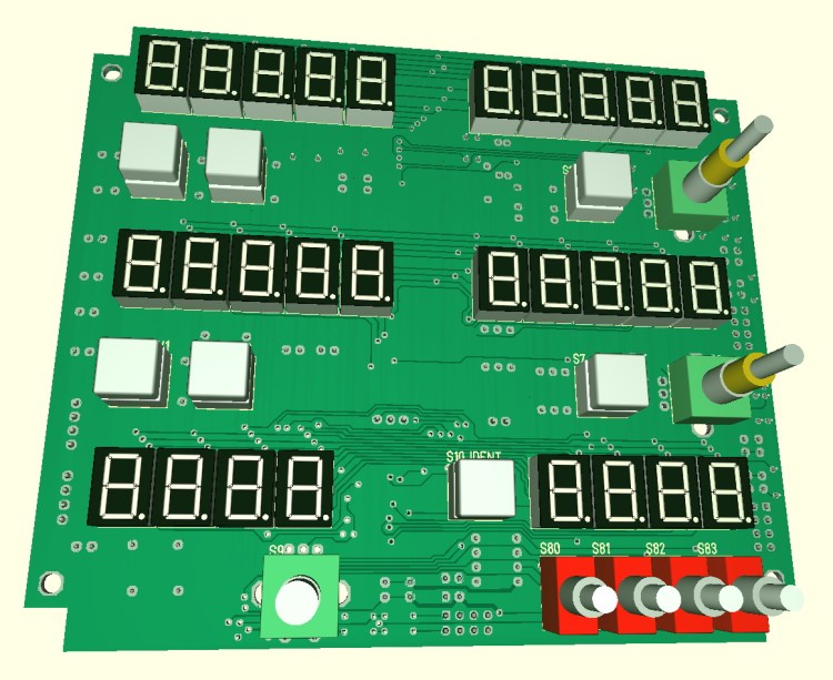 Some mind bending hours passed now, now the PCB for the radio panel is almost done. Laying some of the tracks seemed to be as walking in a maze without exit. But finally after rerouting some formerly layed tracks every signal found it’s place. Most of the parts are THT parts because i don’t like to solder those tiny SMDs. Just the 3 display controlers (MAX7219) and the port expander (MCP23017) are SMDs … but i’m thinking now to use more SMDs in the next design, that would at least make the PCB design process a little bit easier.