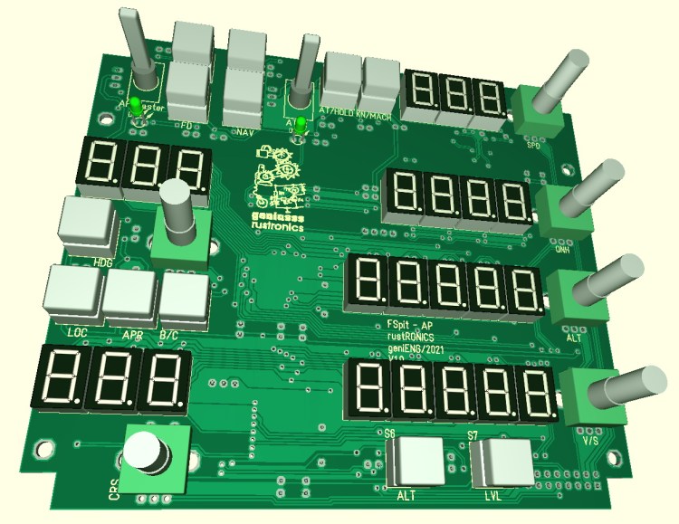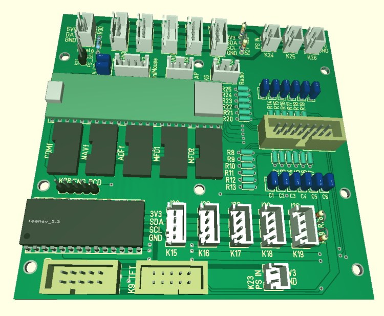 Some days are gone, another PCB design is done. The printer was busy too, after 64hrs of printing it spit out the main frame for the desktop cockpit, a picture will follow in a later update. Most of the panel/module are desigend and ready for the 3D printer, but have to wait a little bit to be printed, had to order new filament. Next bigger step will be the design of a master PCB which will connect to the simulator interface and the to all the switches and displays. Because i have a bunch of MCP23017s with DIL and SOIC packages i’m using them for all the digital DIOs, but because their number is limited to 8 devices on a I2C bus i will have to use a secondary I2C bus on my controller or maybe i have to add a secondary uC. I’m still not sure about that, but what i already know for sure is that i will use a Teensy3.5 as “main” controller.
