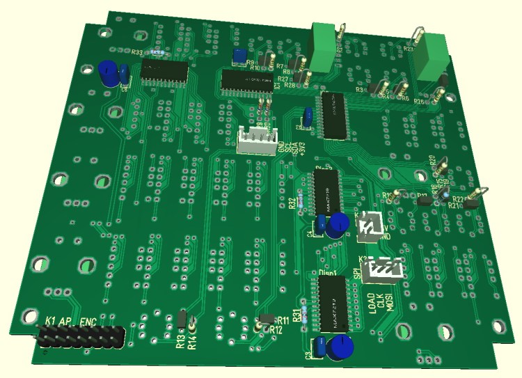 The Teensy3.5 offers a lot of IOs, but even using 8 port expanders (MCP23017 ; 8*16IOs = 122IOs) isn’t enough. So i will use a secondary microcontroller, a Teensy3.2 because it was just there. When starting this project my plan was to build the master PCB on a simple experimental PCB, but now i’m too lazy, not motivated to make dozens of air wires and not in the mood for the troubleshooting afterwards … so i decided to make a dedicated motherboard. Routing is done, here is the PCB previes out of the CAD :