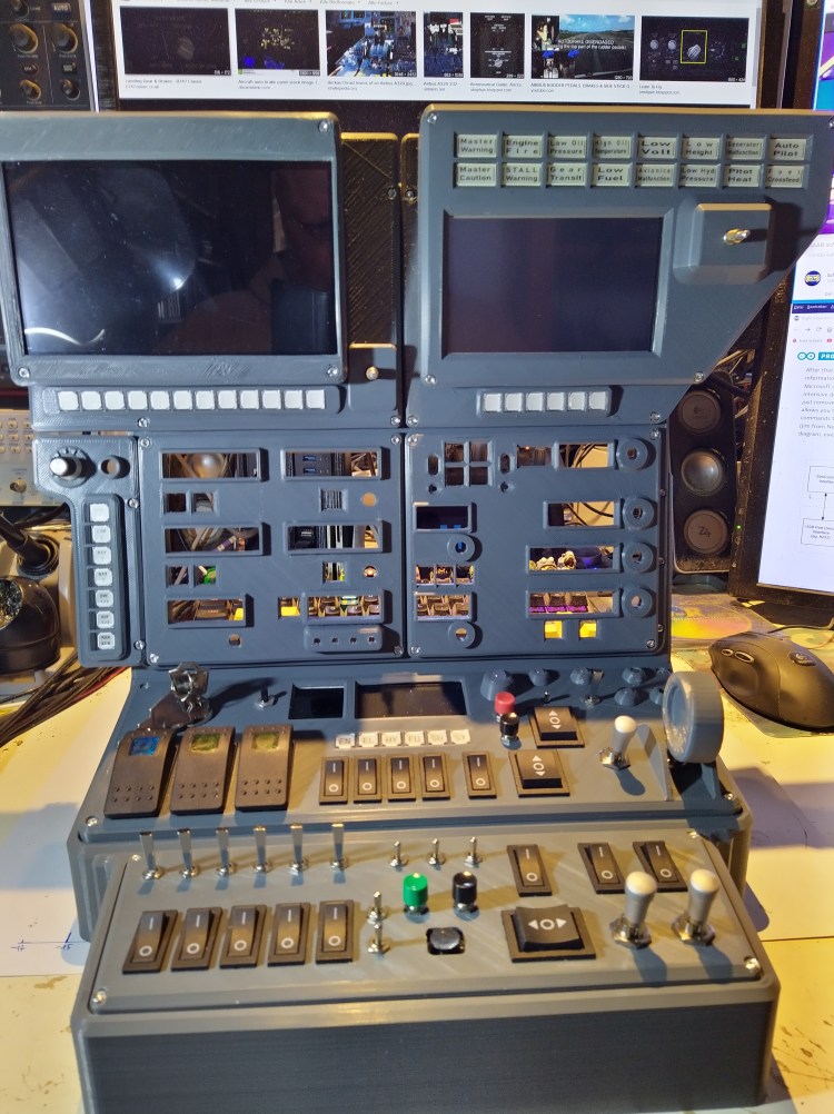 Another new and old project is building a “cockpit” for a flight simulator, not really a cockpit with seats and coffee maker, just an instrument panel with some switches. In the past i already built some panels, but they were just some switches in shoebox with some light bulbs. Many years ago as a kid i started my virtual pilot career with the flight simulator 1 and since then i was flying with all new appearing versions. Not only those from Microsoft, also X-Plane and many others. Last year, after 14 long years, Microsoft published a long awaited new version. Now, with my new 3D printer i’m able to print big parts (40cmx40cmx40cm), time for a new desktop “cockpit”.