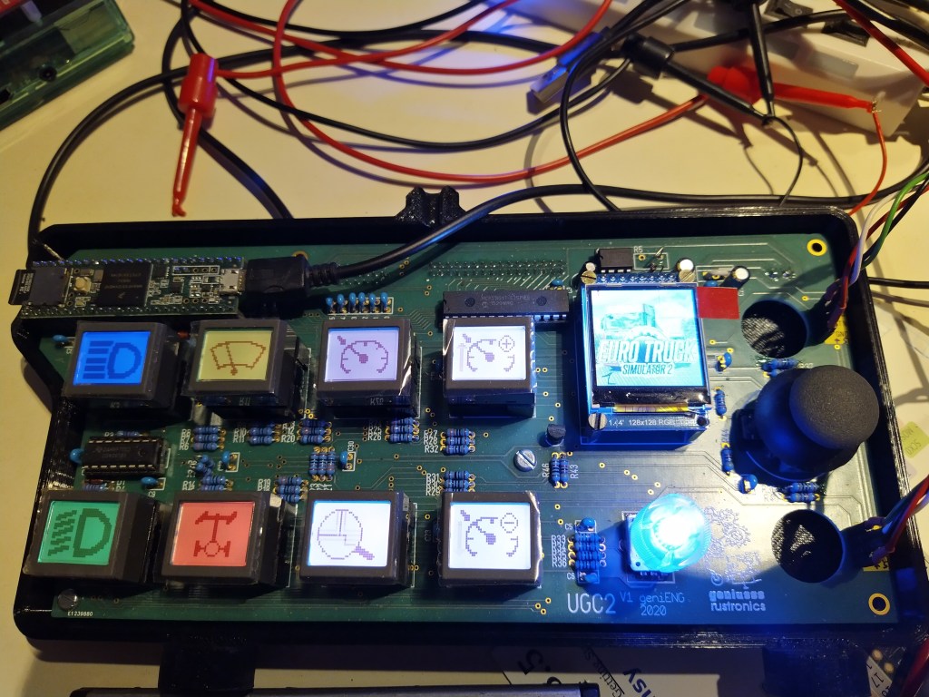 I’m using a Teensy 3.5 which has a powerful 32bit MCU, 8 NKK smart switches, a rotary encoder with RGB backlighting, a 128x128pixel TFT display, a mini joystick and 2 push buttons (outside picture on the right).